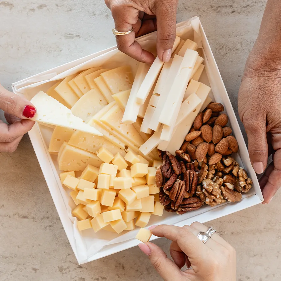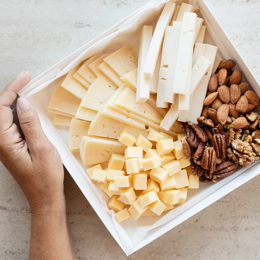 מבחר גבינות שמתאימות לאירוח בוקר, וגם קצת אגוזים, שקדים ופקאנים לאירוח מושלם