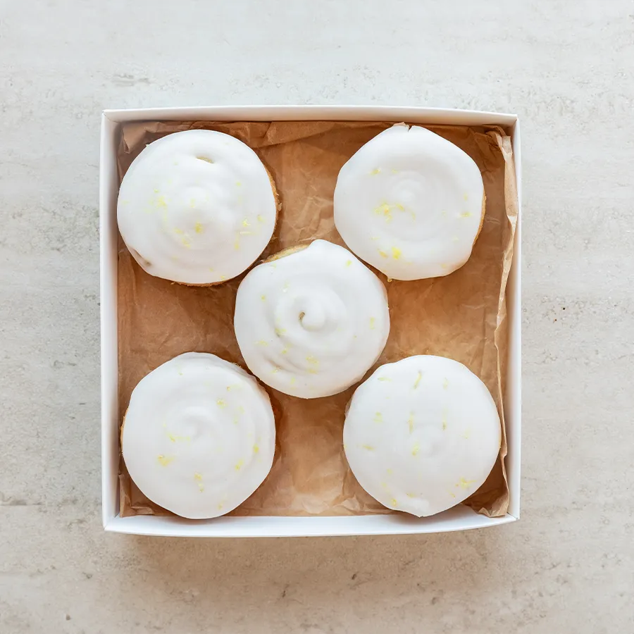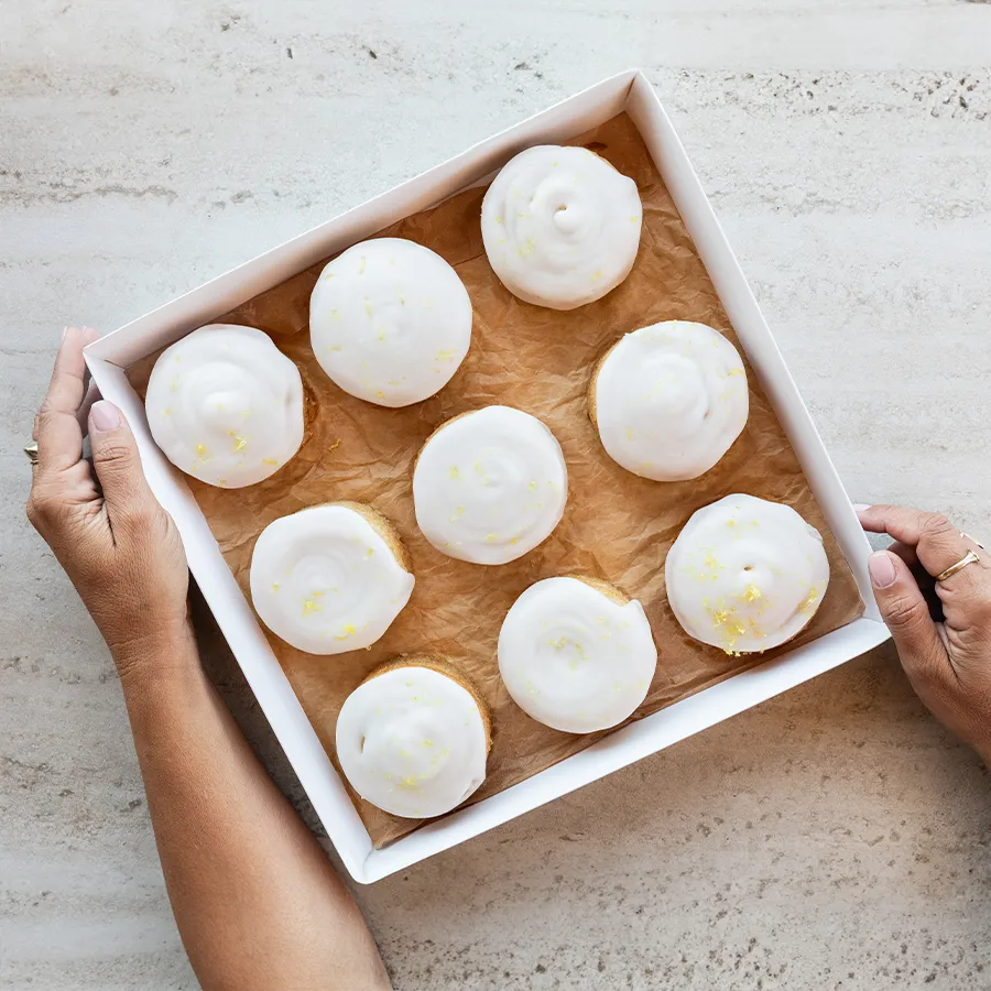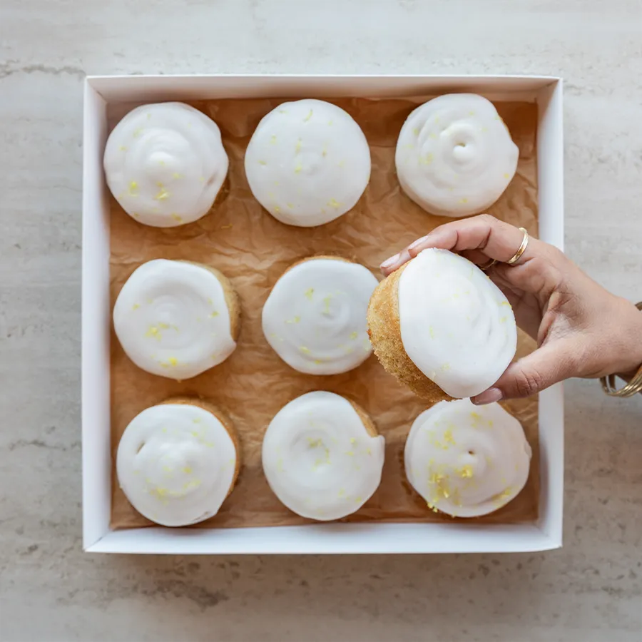 מגש עוגות לימון טבעוניות, רכות ולחות, עם זיגוג לימון טרי שמוסיף רעננות ומעט חמיצות נעימה