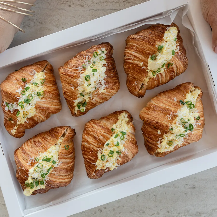 קרואסון חמאה פריך, ממולא מקושקשת רכה וטרייה, בצל ירוק קצוץ ופרמזן דק.