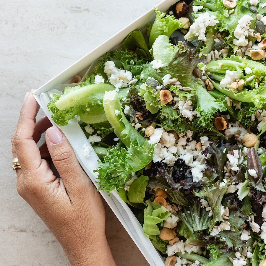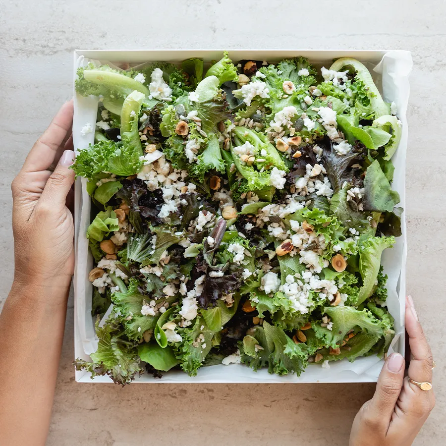 סלט עלים טריים ומרעננים שגדלים בחממה ההידרופונית בגבעת יואב, אגוזי לוז קלויים וגבינת פטה כבשים מצוינת.