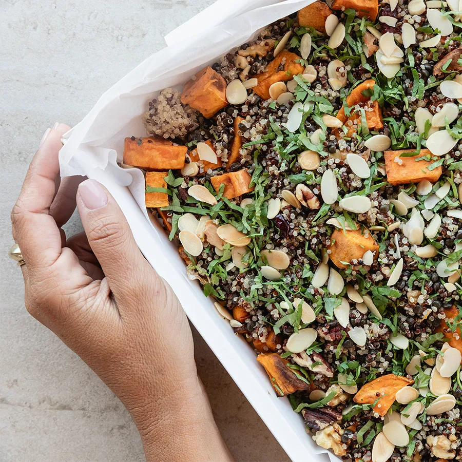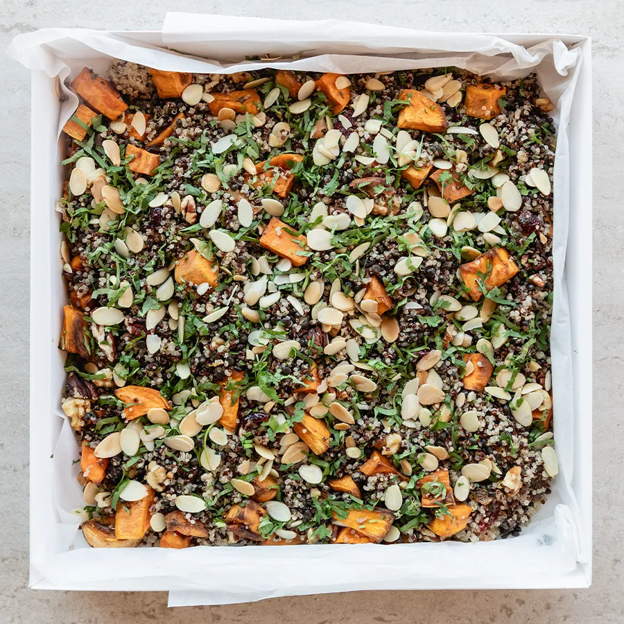סלט קינואה, עדשים שחורים, בטטה צלויה, אגוזים, שקדים, חמצויות, צימוקים, פטרוזליה וכוסברה. מתובל בהמון שמן זית ולימון טרי.