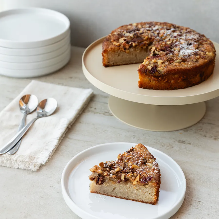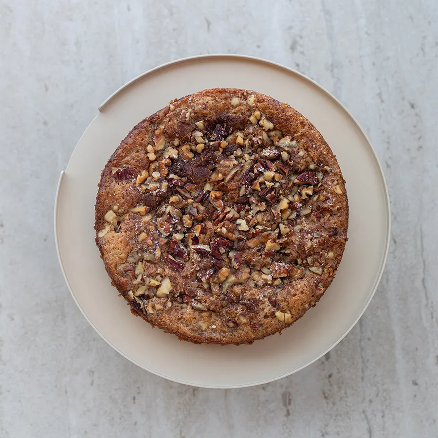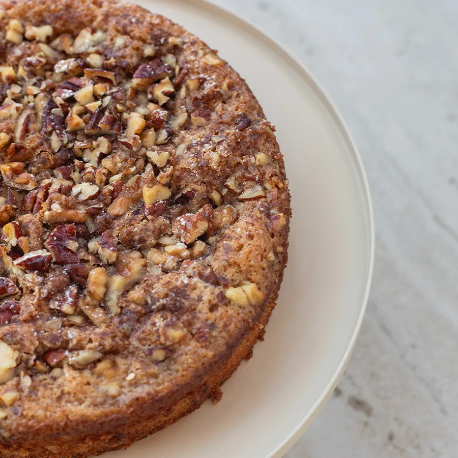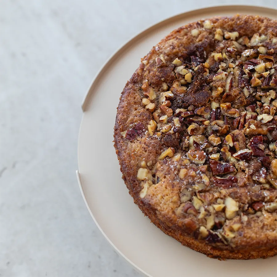 עוגה בחושה, נימוחה ועסיסית, עם שכבת אגוזים קראנצ’ית, קינמון ומייפל אמיתי שמוסיף מתיקות עדינה.